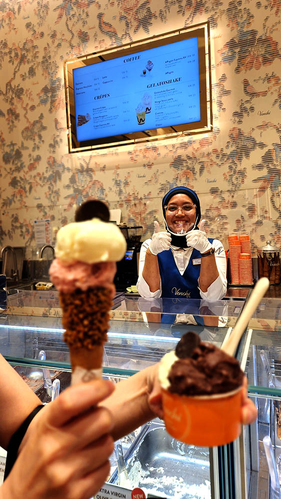 A commemorative photo with the ice cream we ate and the shop staff.